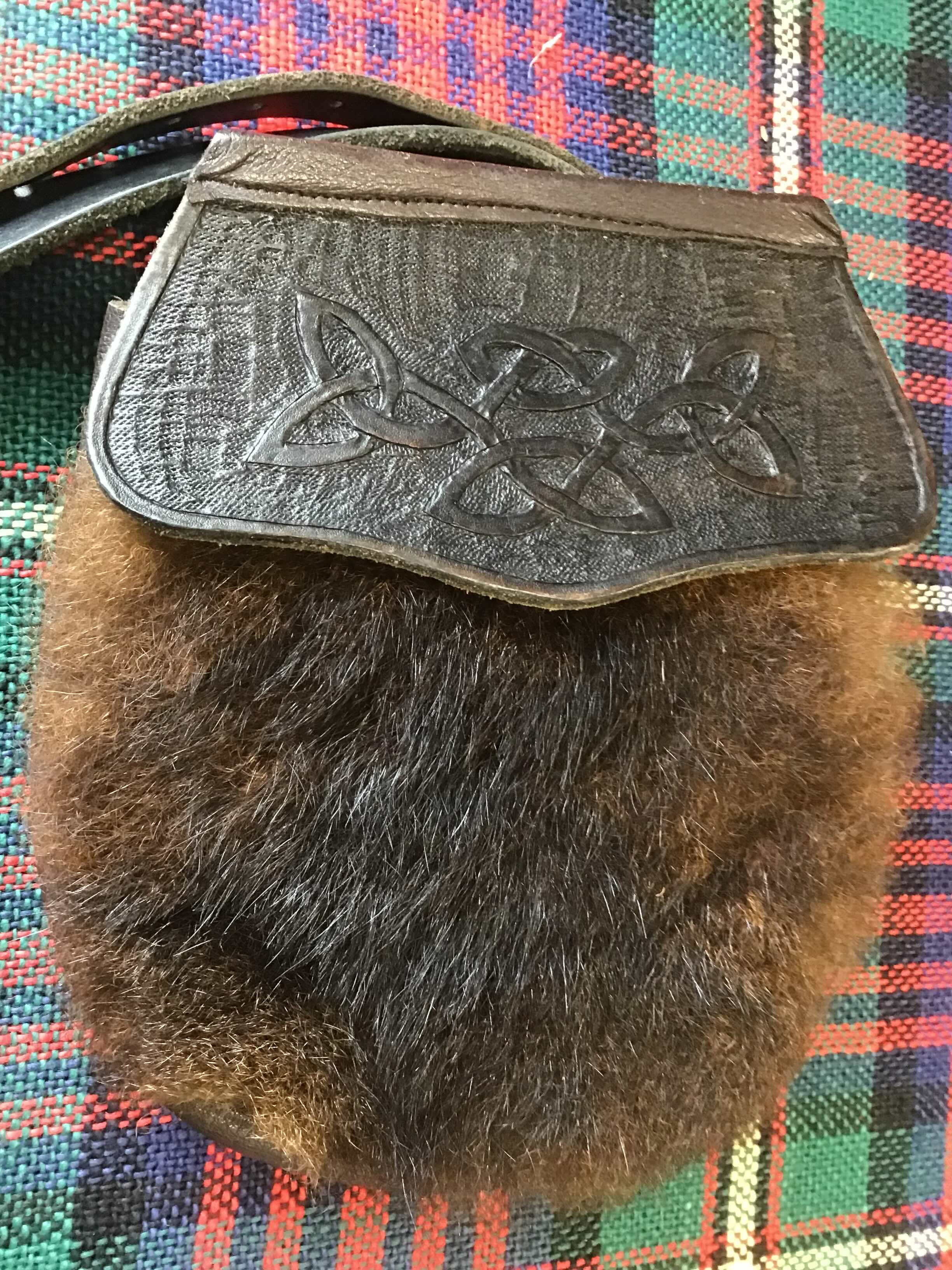 Possum fur sporran with hand tooled leather flap Width 18 cm / Length 21cm Straps included. Price: $120.00