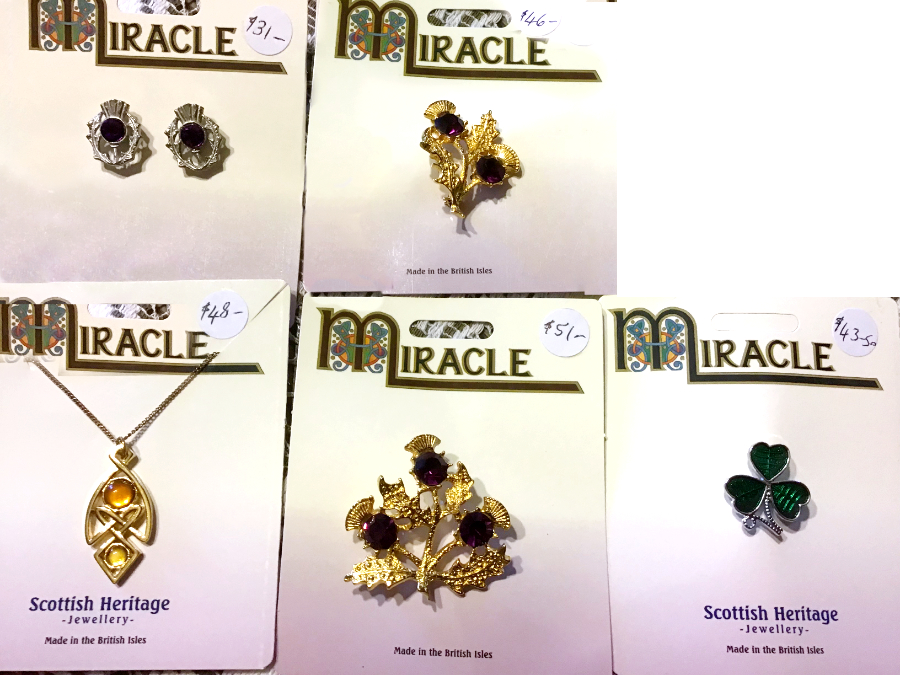 EARRINGS PENDANTS AND BROOCHES Thistle earrings - Amethyst - $31.00 Topaz Pendant - $48.00 Double thistle brooch - Amethyst - $46.00 Triple thistle brooch - Amethyst - $51.00 Shamrock brooch - small - $43.50 |