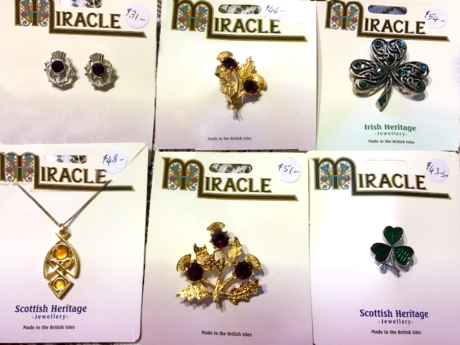 EARRINGS PENDANTS AND BROOCHES Thistle earrings - Amethyst - $31.00 Topaz Pendant (gold plated) $48.00 Double thistle brooch (gold plated) - Amethyst - $46.00 Triple thistle brooch (gold plated) - Amethyst - $51.00 Shamrock brooch - Emerald stones - $54.00 Shamrock brooch - small - $43.50 |